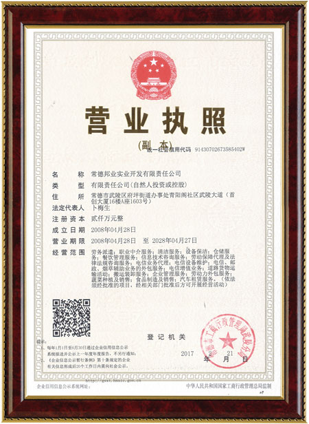 常德邦業(yè)實業(yè)開發(fā)有限責任公司(原名常德市邦業(yè)人力資源開發(fā)有限責任公司)是經湖南省人力資源和社會保障廳核準備案,常德市人力資源和社會保障局批準,常德市工商行政管理局登記注冊的一家綜合性人力資源服務型企業(yè)。公司成立于2008年4月28日,注冊資本2000萬元。